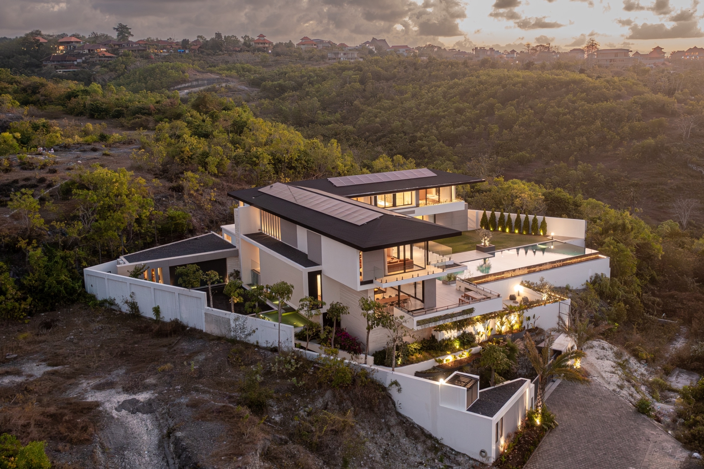 Positioned on a 16-are (1,600 m²) hillside estate, the villa offers secure private access, landscaped gardens, and a white perimeter wall for complete privacy. Its multi-level modern architecture is enhanced by a flat roof with solar panels and generous outdoor lounging areas that suit Bali’s tropical rhythm.
