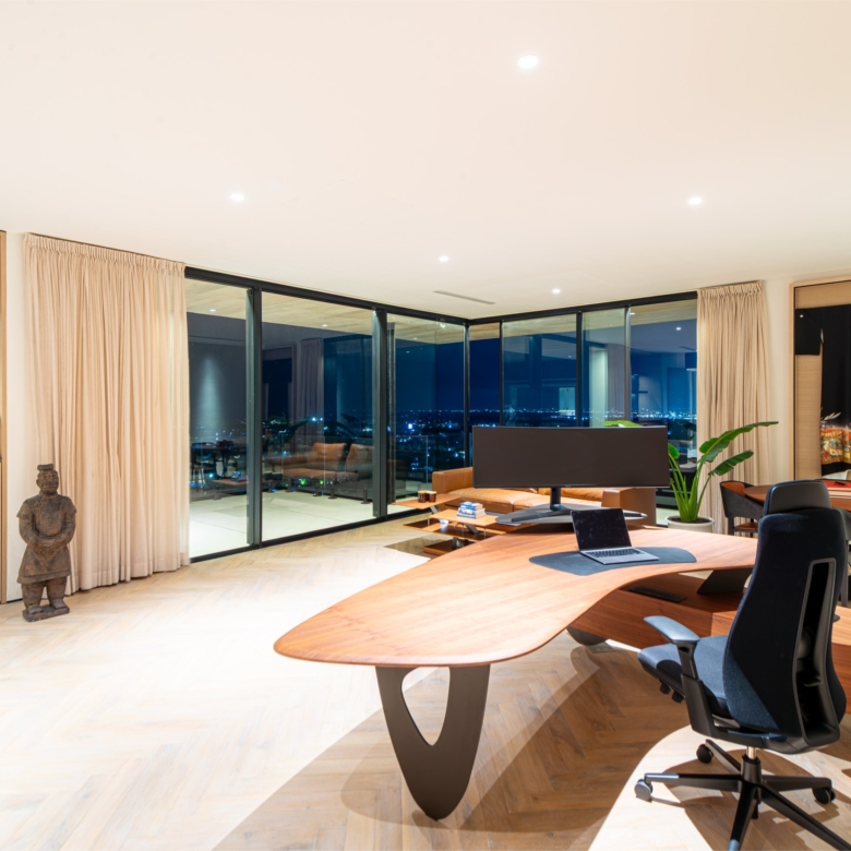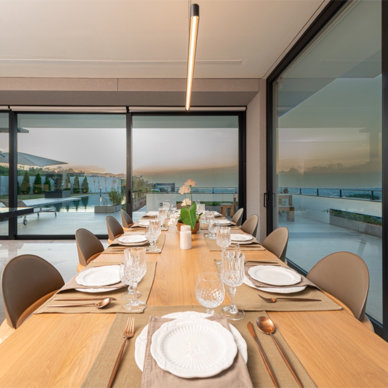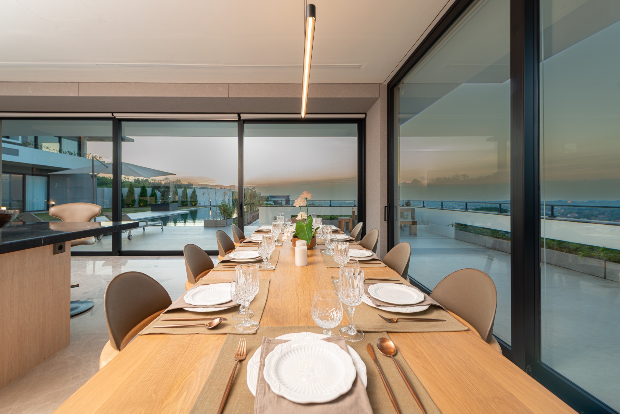 Finishes are calm and contemporary: light stone flooring, a solid wood dining table illuminated by a linear pendant feature, and elegant glass-lined spaces that capture distant sunsets and Bali’s evening city lights, creating a serene yet social atmosphere.